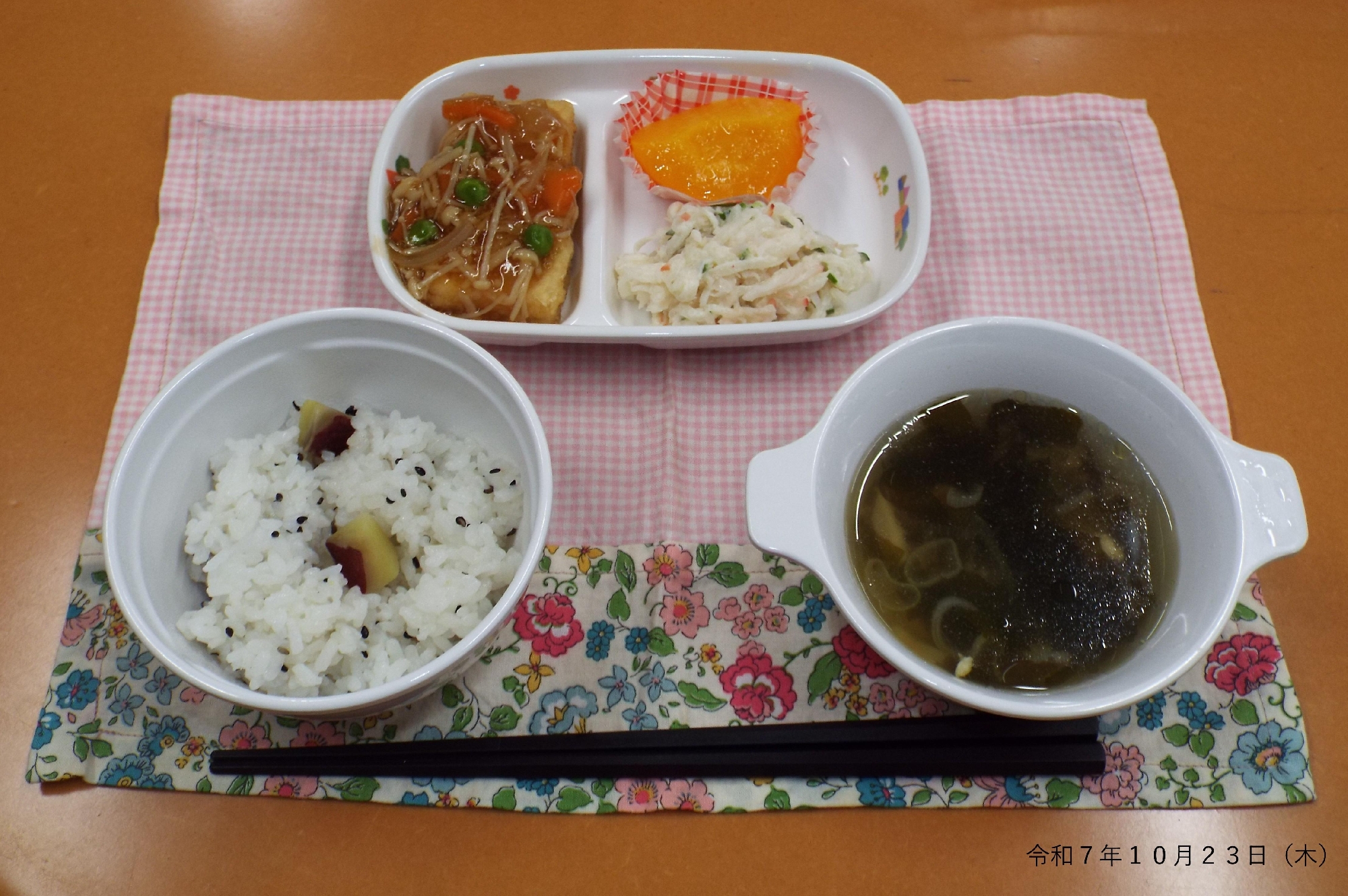 本日の給食は、薩摩芋ご飯、揚げ出し豆腐の野菜あんかけ、大根サラダ、鶏の葱塩スープ、黄桃でした。