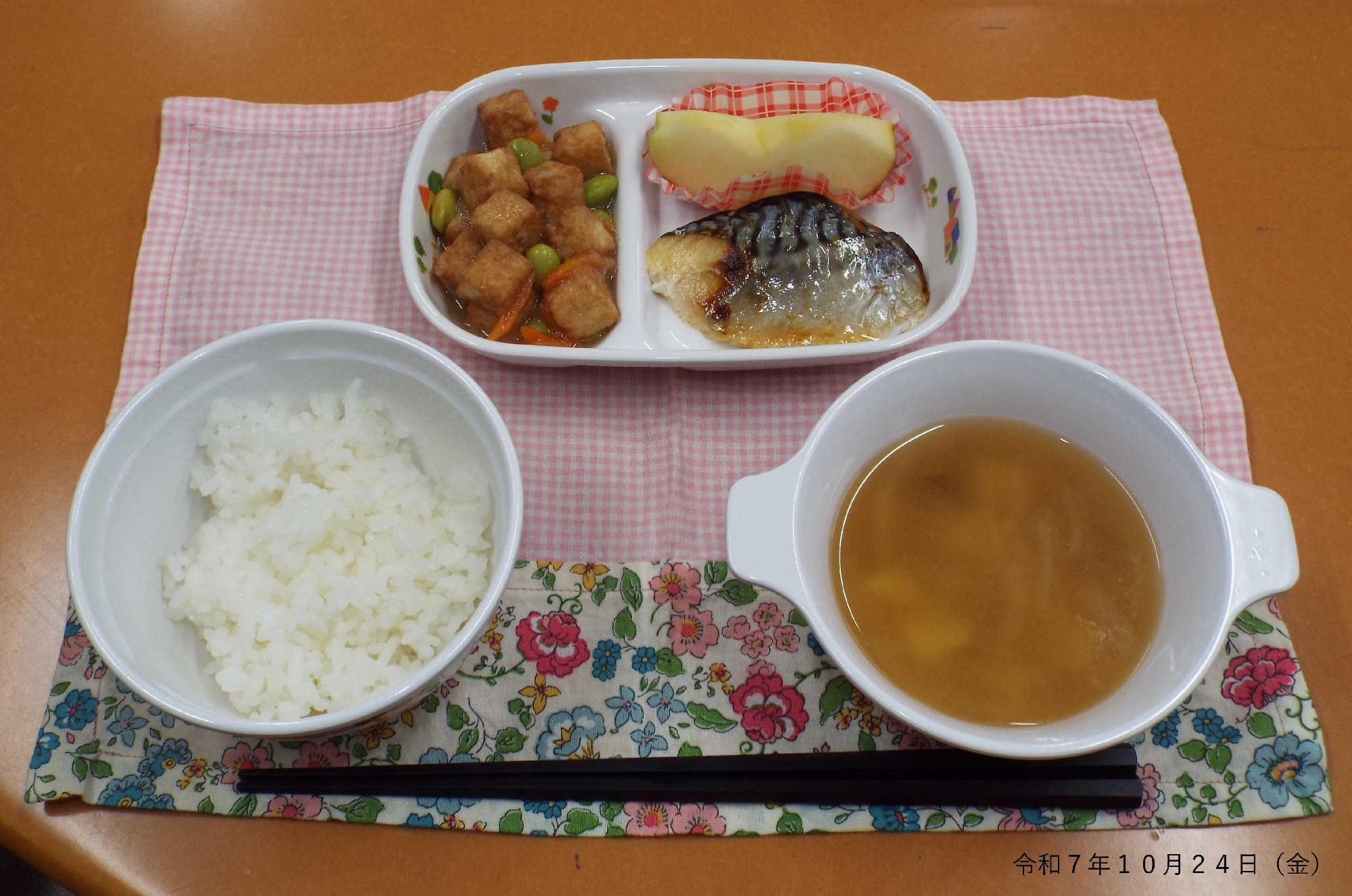 本日の給食は、鯖の塩焼き、厚揚げのみぞれ煮、薩摩芋と玉ねぎの味噌汁、りんごでした。