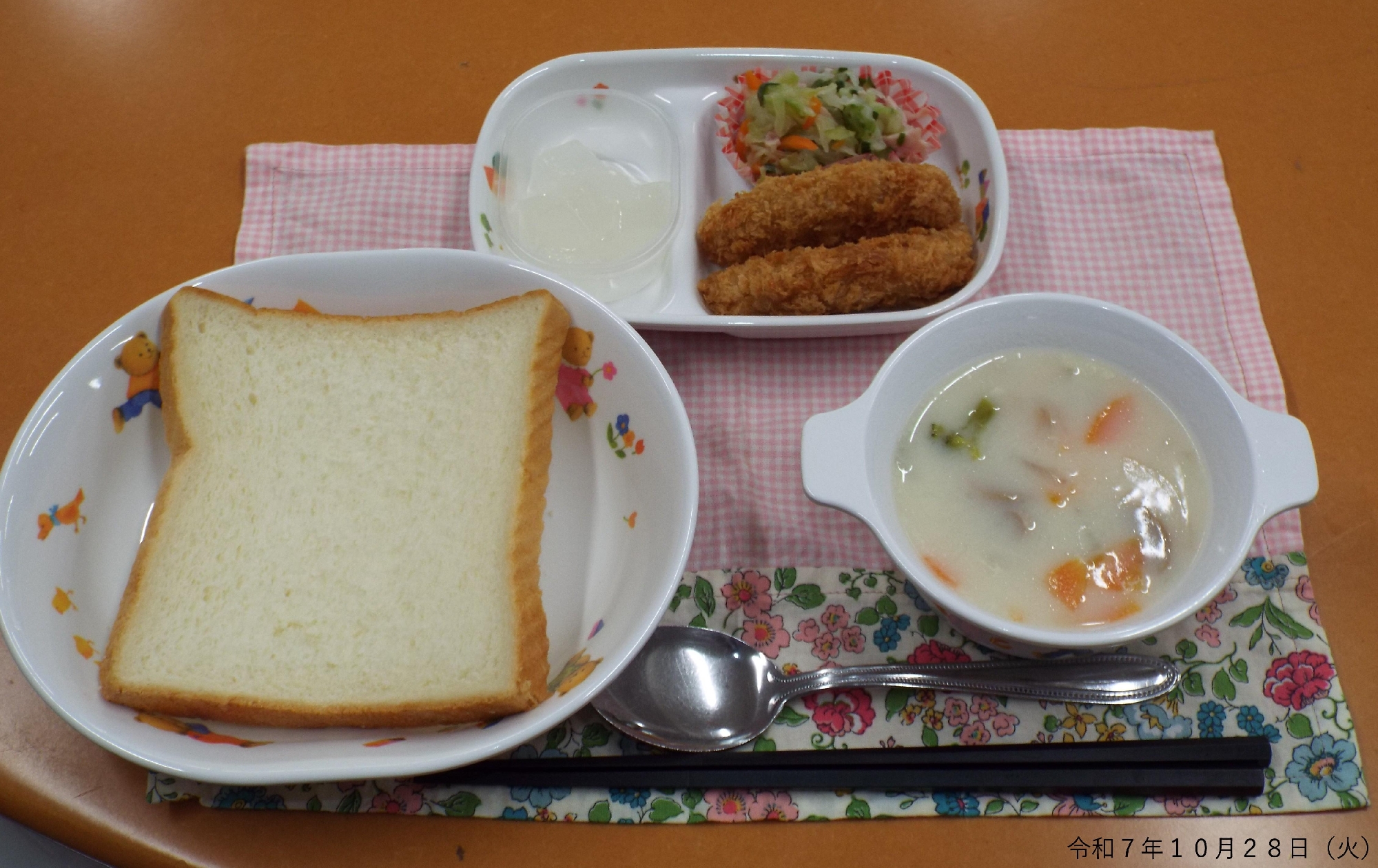 本日の給食は、男爵コロッケ、イタリアンサラダ、キノコのクリームスープ、洋梨ダイスゼリーでした。