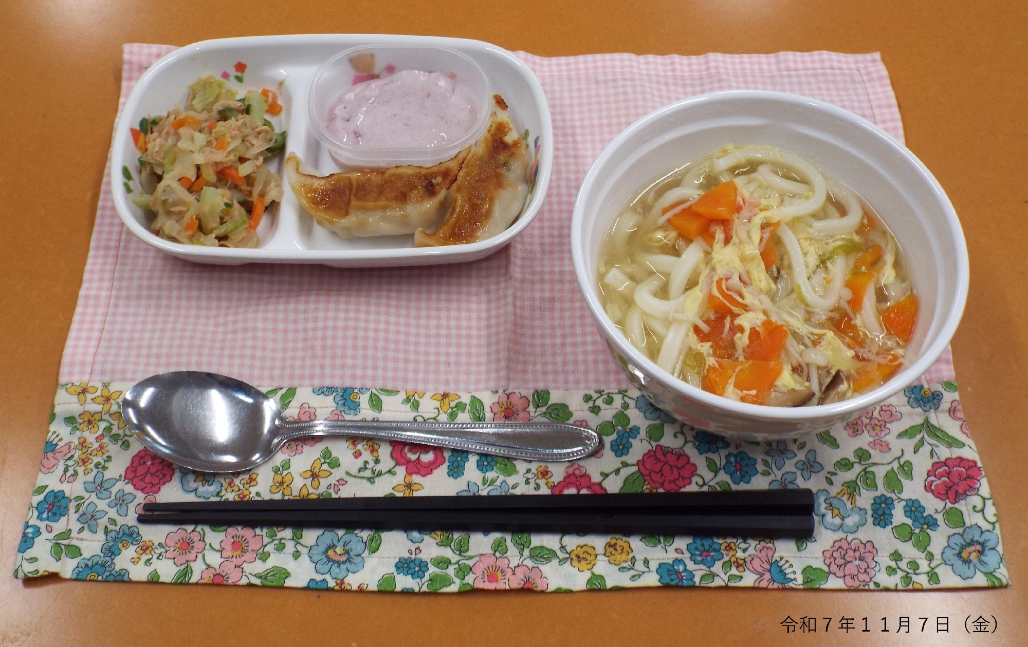 本日の給食は、かきたまうどん、餃子、ツナサラダ、ミックスベリーフルーチェでした。