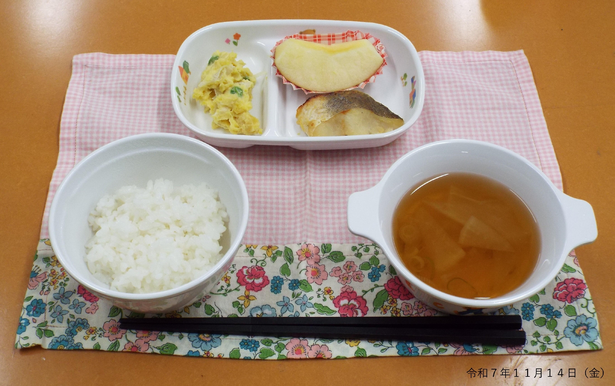 本日の給食は、鱈の西京焼き、薩摩芋のサラダ、大根と葱の澄まし汁、りんごでした。