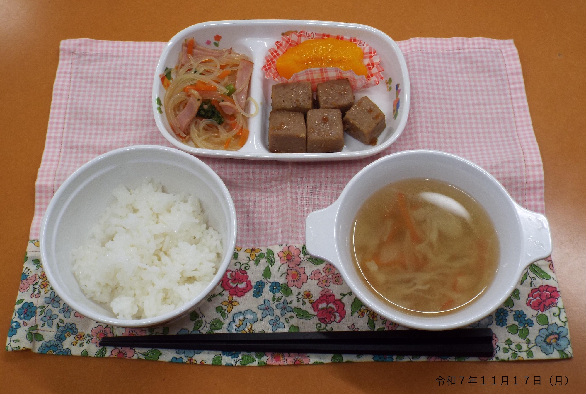 本日の給食は、サイコロステーキ、春雨サラダ、ジュリアンヌスープ、黄桃でした。