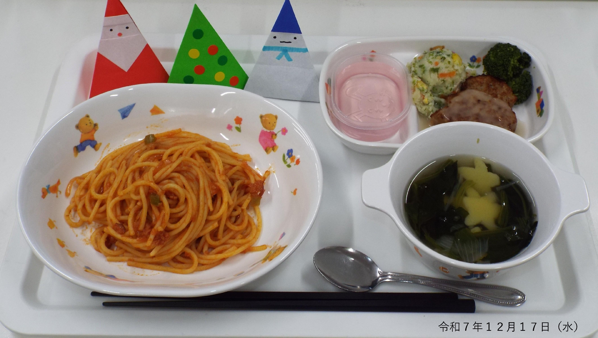 本日の給食は、ナポリタン、もみのきハンバーグホワイトソース、カラフルポテト、ブロッコリーのコンソメ煮、星のスープ、ピーチゼリーでした。