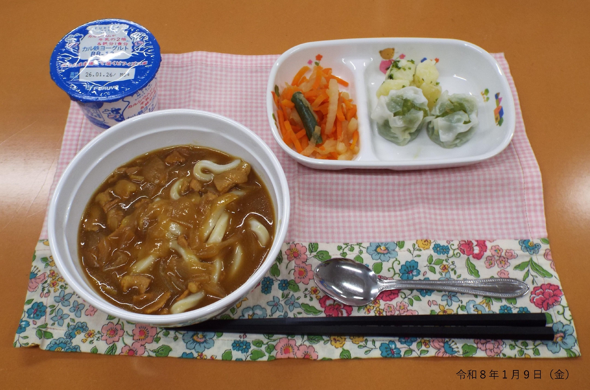 本日の給食は、カレーうどん、ほうれん草の焼売、大根きんぴら、青のりポテト、カル鉄ヨーグルトでした。