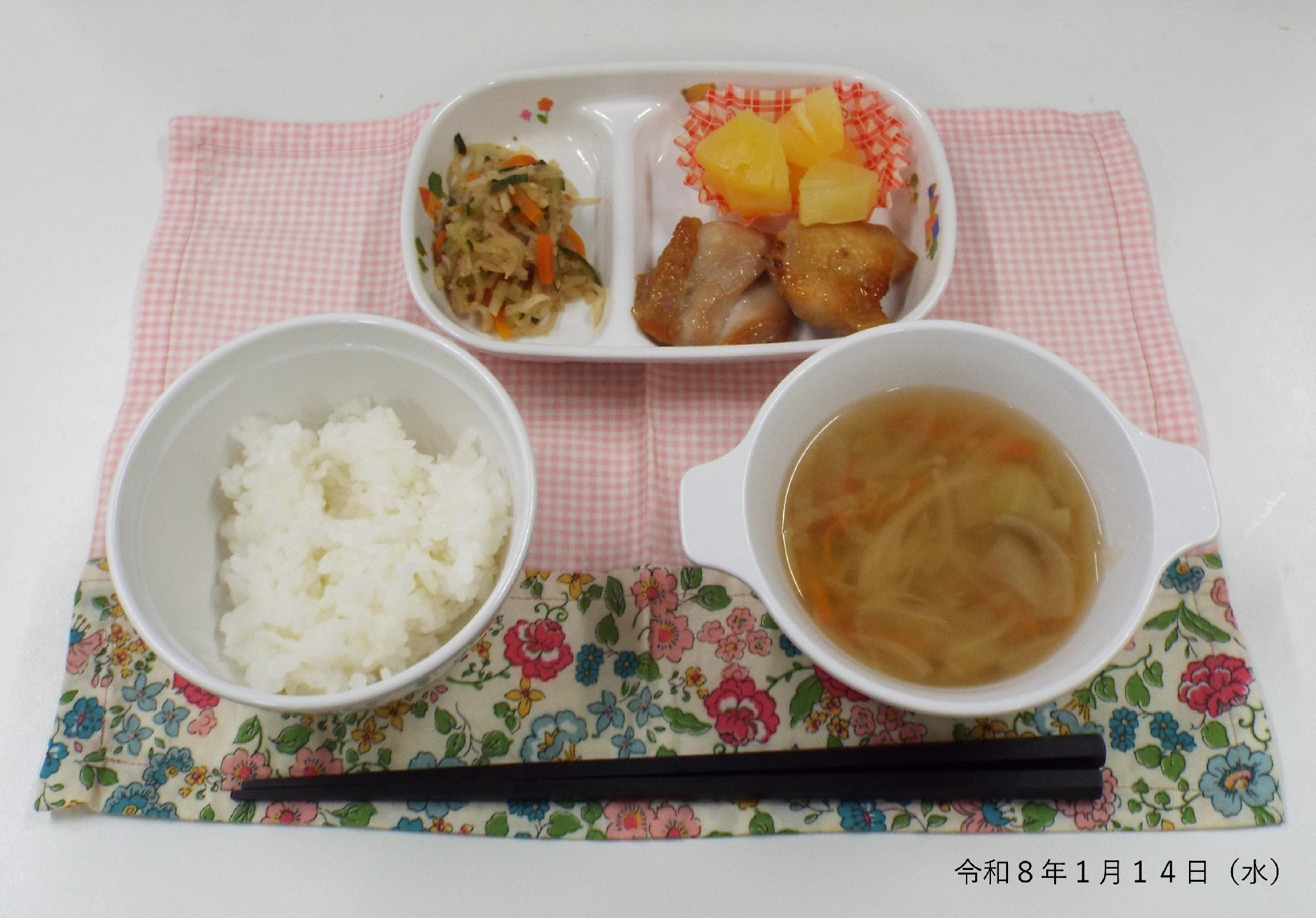 本日の給食は、鶏の照り焼き、切り干し大根サラダ、ジュリアンヌスープ、パインでした。