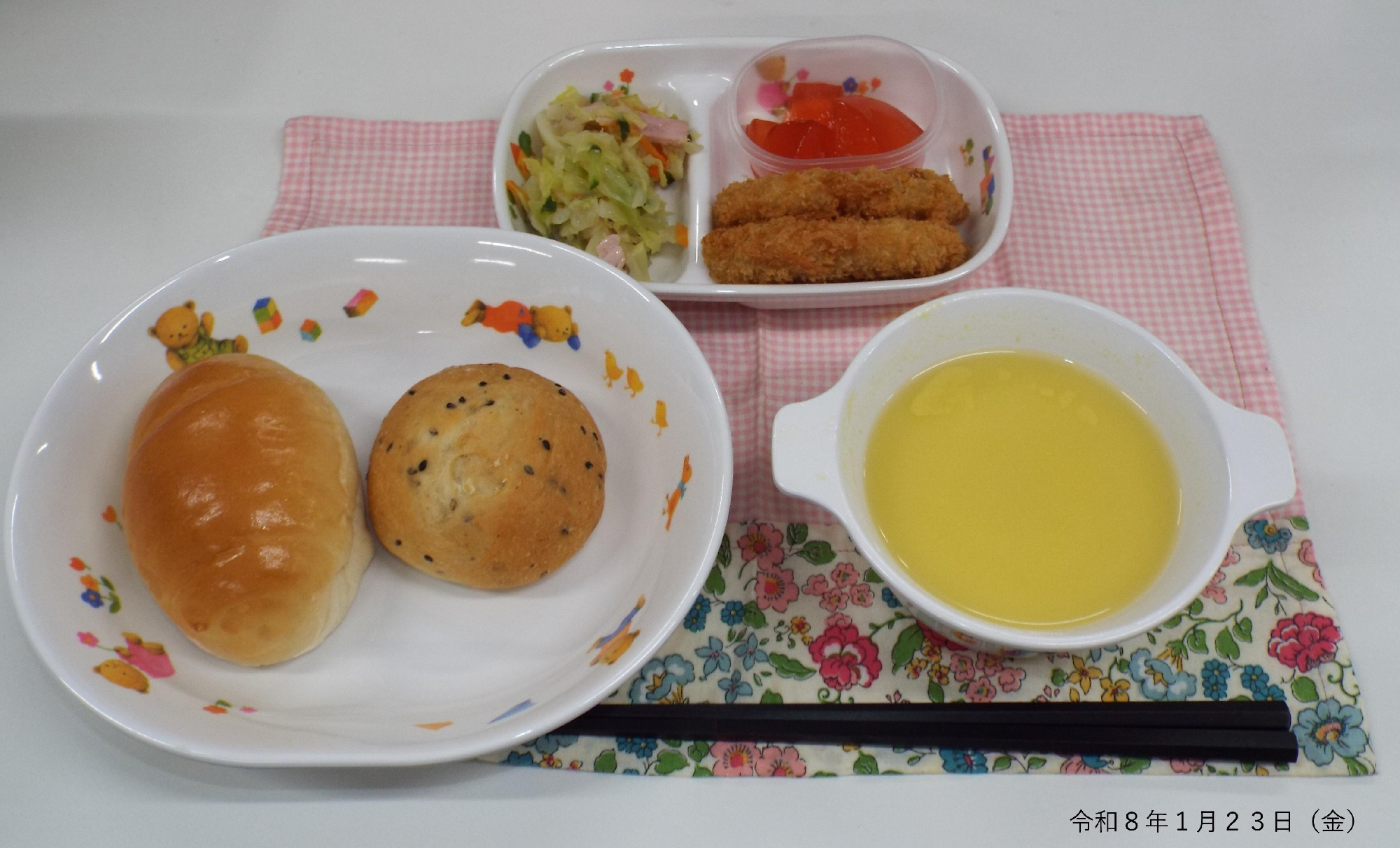 本日の給食は、ロールパン、胡麻パン、男爵コロッケ、イタリアンサラダ、コーンポタージュ、苺ダイスゼリーでした。