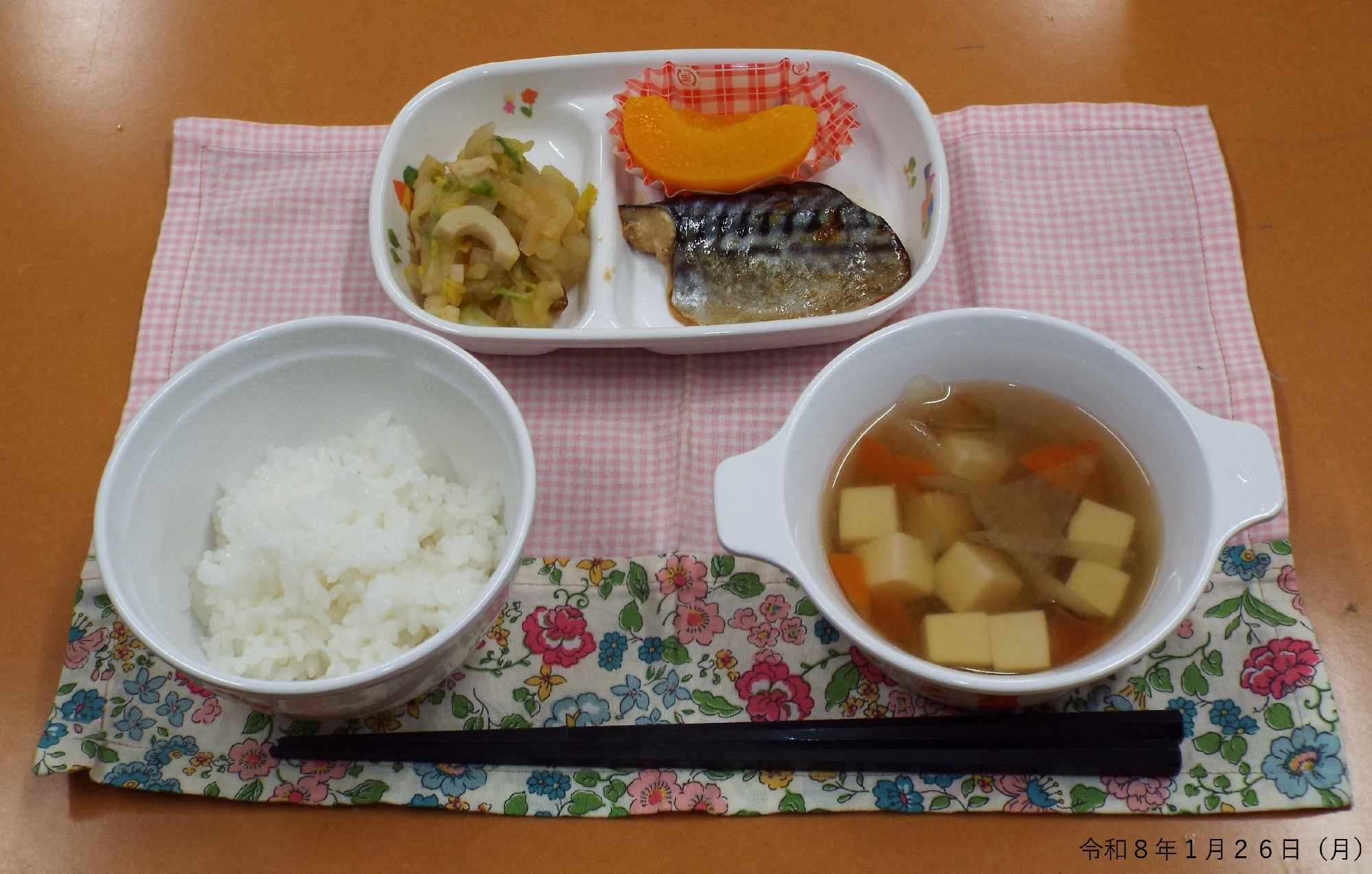本日の給食は、サバの味噌煮、白菜とちくわの和え物、けんちん汁、黄桃でした。