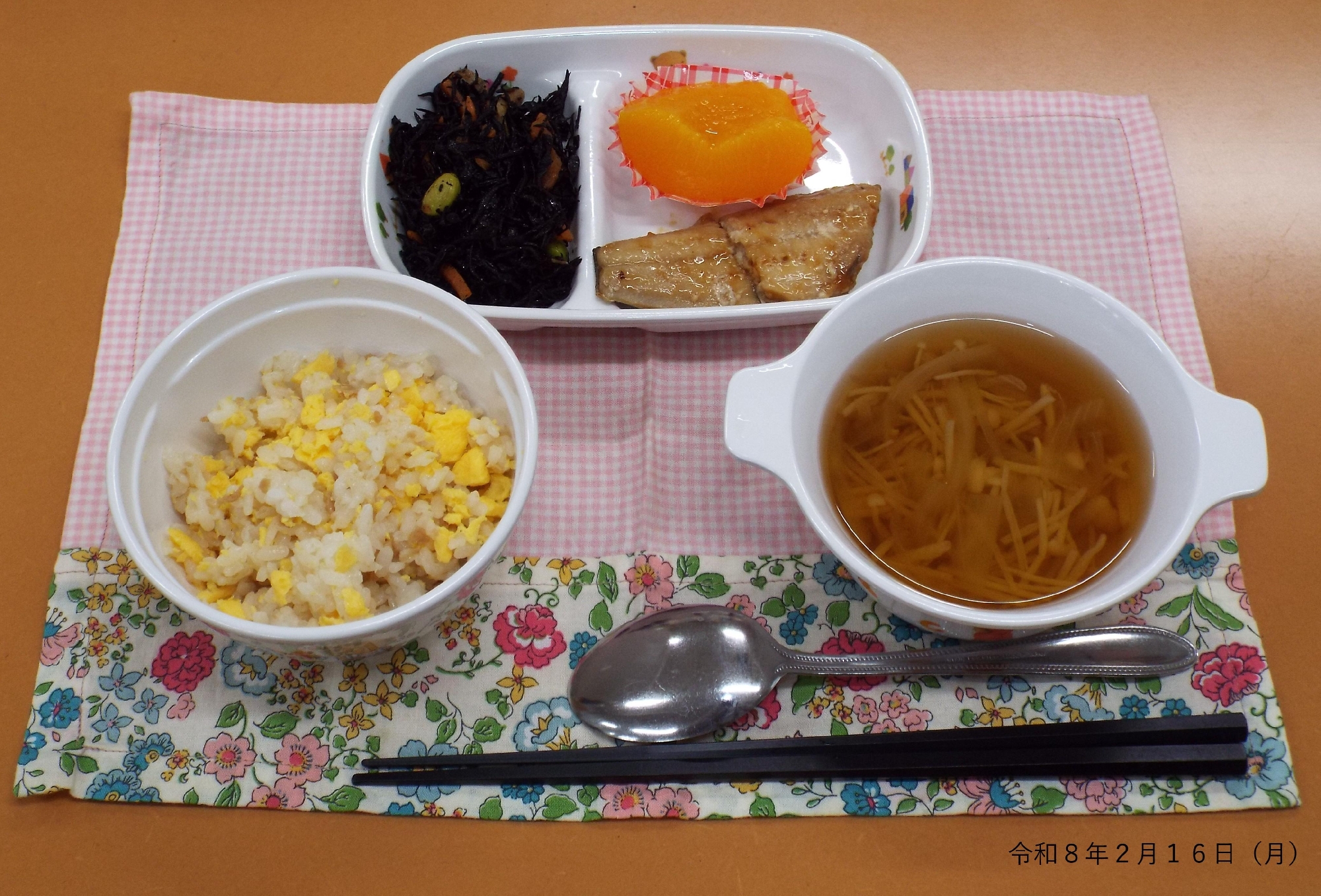 本日の給食は、二色丼、ホッケの照り焼き、ひじきの煮物、えのきと玉ねぎの澄まし汁、黄桃でした。